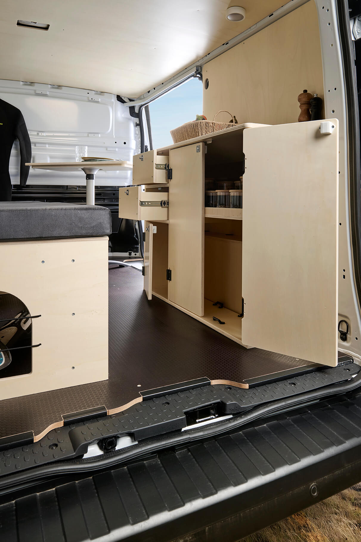 Le plancher bois est en contreplaqué antidérapant bouleau de 12 mm avec des barres de seuil incorporées en aluminium . Les côtés latéraux , les portes arrières ainsi que la porte latéral sont constitués de contreplaqué peuplier 8 mm vernis . Concernant nos passages de roues , ils sont en contreplaqué antidérapant bouleau 12 mm .