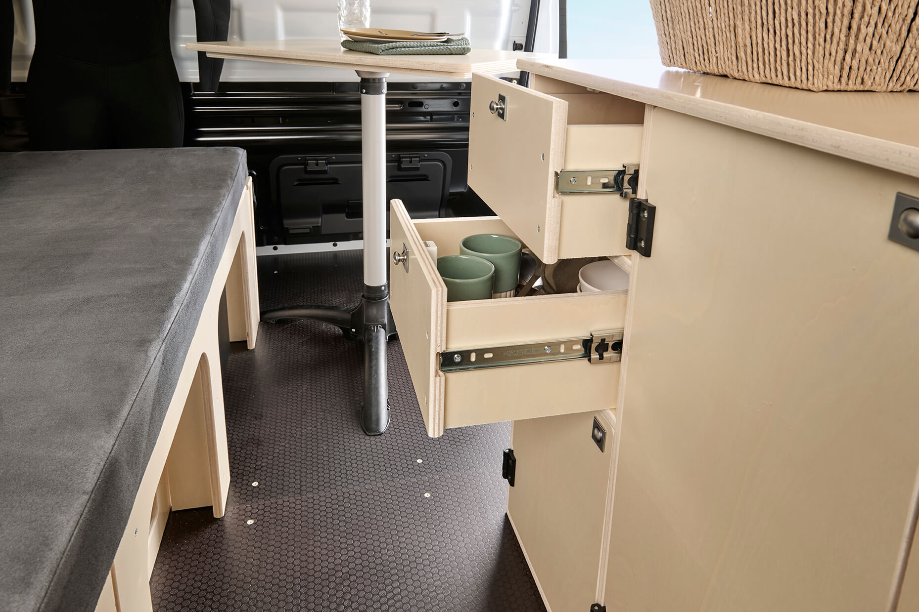 Notre kit d’aménagement pour van OPEL VIVARO L2H1 contient également une table , celle-ci est démontable grâce à son pied amovible en aluminium « FIAMMA » et est composé d’un contreplaqué de 15mm avec les deux face vernis .